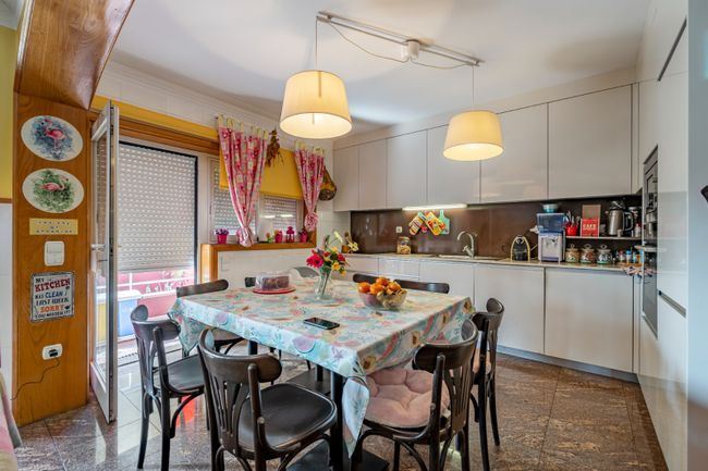 - Rés do chão: Sala de estar e jantar com varanda, cozinha equipada Siemens/Bosch com varanda e despensa, WC de serviço.